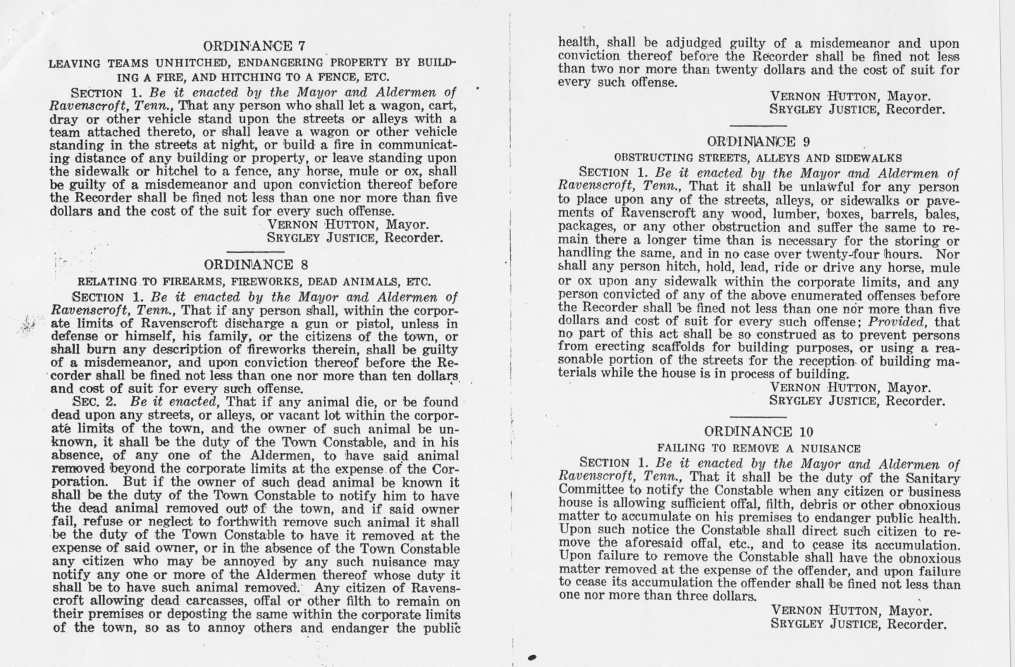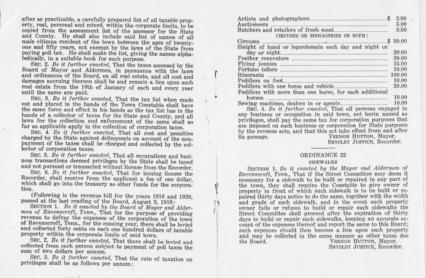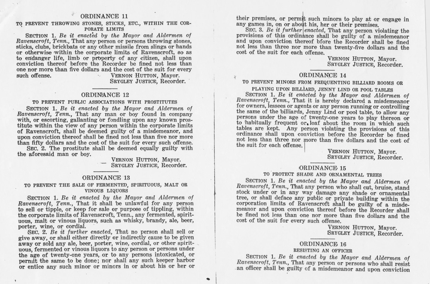 The railroad was extended from Bon Air Mountain through DeRossett , a railroad section town, to Ravenscroft in 1904. Ravenscroft was incorporated as a new town in 1908 and residents were able to choose a mayor, recorder, and other town officials. The ordinances / laws were very different from today. A copy of the 1918 Code of Ordinances that was adopted under Mayor Vernon Hutton is below.